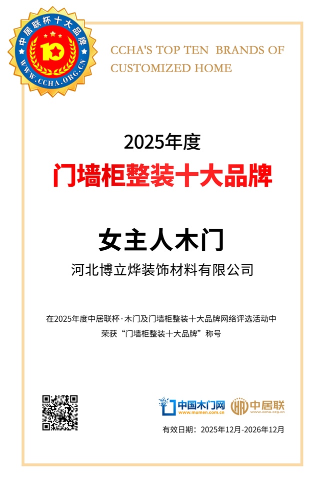“中居联杯·2025年度门墙柜整装十大品牌”的获得,是行业与市场对女主人木门综合实力的充分肯定。该荣誉不仅代表着消费者对品牌品质与服务的高度认可,也体现了企业在整装领域持续深耕与稳健发展的成果。